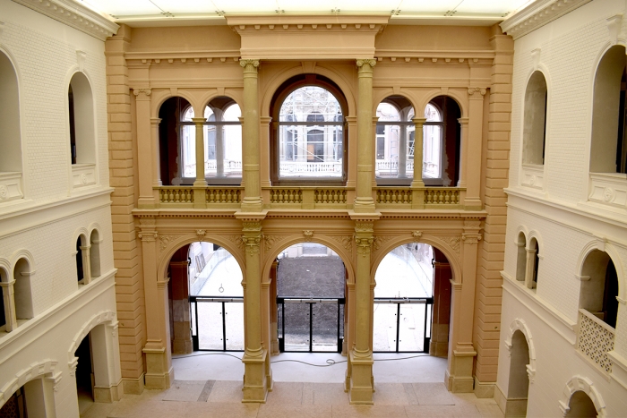 Az elmúlt időszakban számos új apró komponens került napvilágra, amelyeket a szakemberek beépítettek a létesítmény tervváltoztatásaiba is: ilyen többek közt a szivarszoba kandallójának meglelt kerámiadíszítése is. A résztvevőket a kivitelezés lebonyolítói és műszaki ellenőri feladatait ellátó ÉMI Nonprofit Kft. részéről Szegő Tamás műemlékvédelmi referens és Ónodi Géza projektvezető kalauzolta. A bejárás a Múzeum utca felől indult, így rögtön abba az előcsarnokba érkeztünk, ahol a fotókról méltán híres íves falépcső is található. Ónodi Gézával is itt beszélgettünk, ezáltal pedig rengeteg érdekességet megtudhattunk a felújításról.