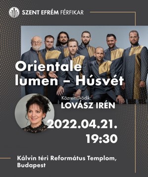 A 20 éves férfikar a Kossuth-díjas énekesnővel, Lovász Irénnel áll színpadra 2022. április 21-én, pénteken 19 órakor tartja idei húsvéti koncertjét a fennállásának 20. évfordulóját ünneplő Szent Efrém Férfikar.